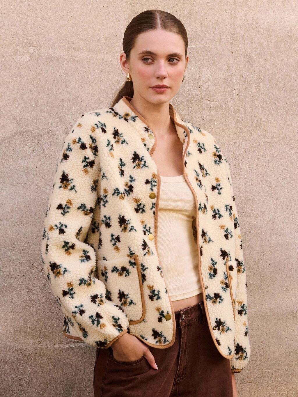 Creme Blumen Muster Sherpa Jacke mit Kontrastpaspeln und Druckknopfverschluss Frühling Sommer Jacke Frühling Damen Kleidung Ausgeh Jacken