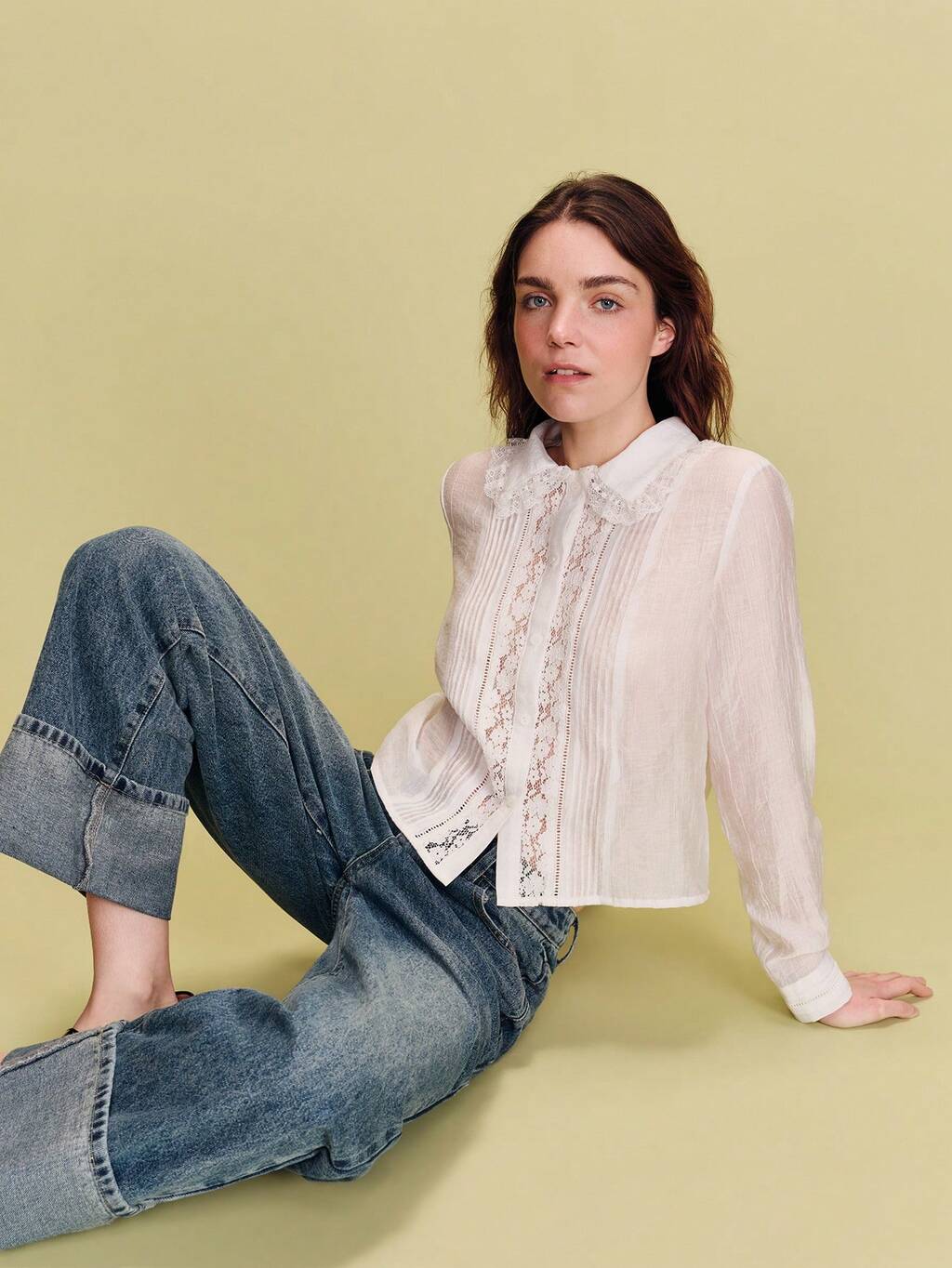 Chemise blanche vintage à manches longues avec garnitures en dentelle et détails plissés. Style printemps-été, style français parisien, Top mignon vintage, Top de bureau