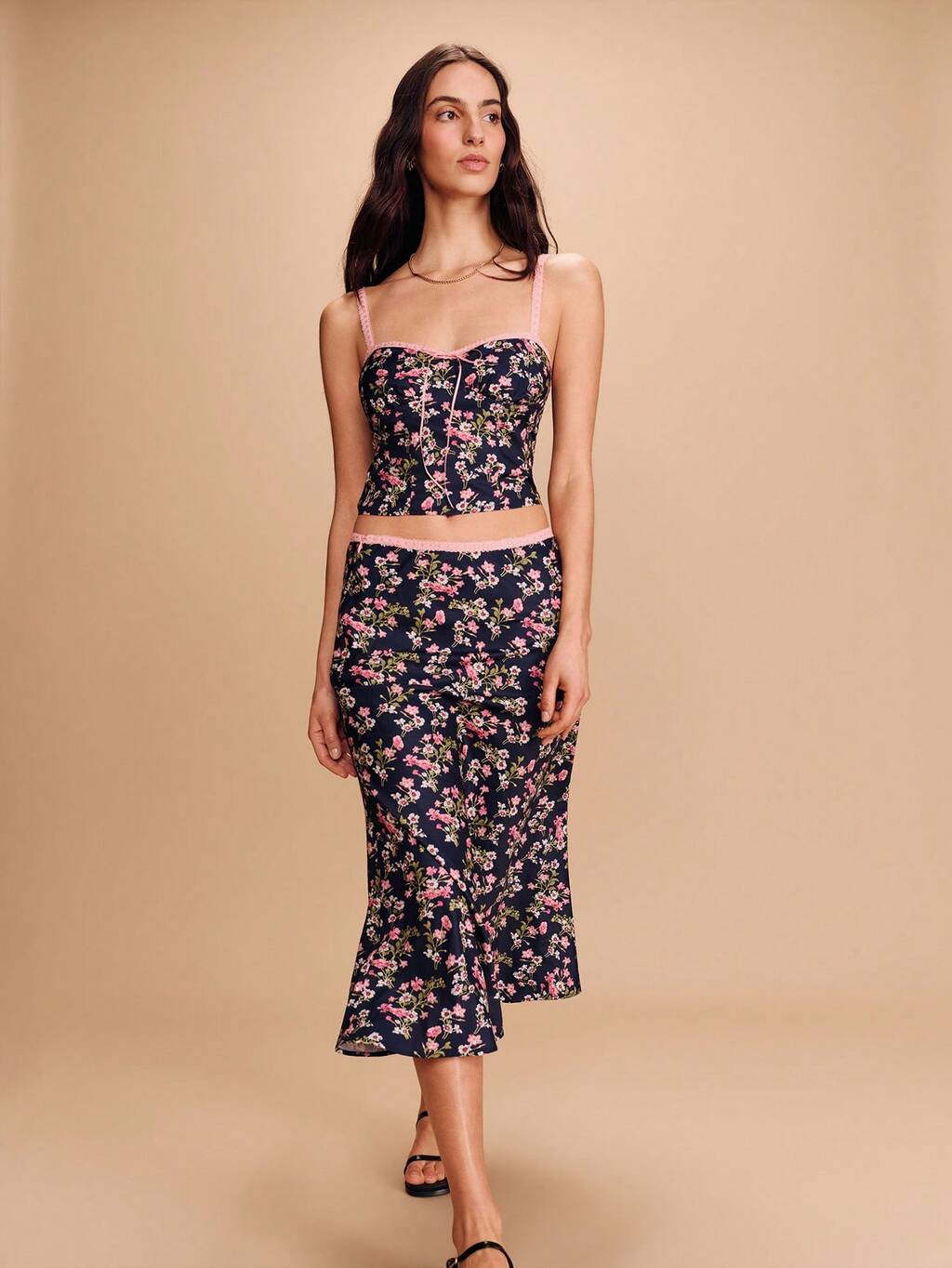 Gonna midi vintage con stampa floreale e dettaglio in pizzo rosa sulla vita, stile primaverile estivo, stile francese parigino, adatta per vacanze, set da donna con gonna midi a due pezzi, gonna estiva a due pezzi