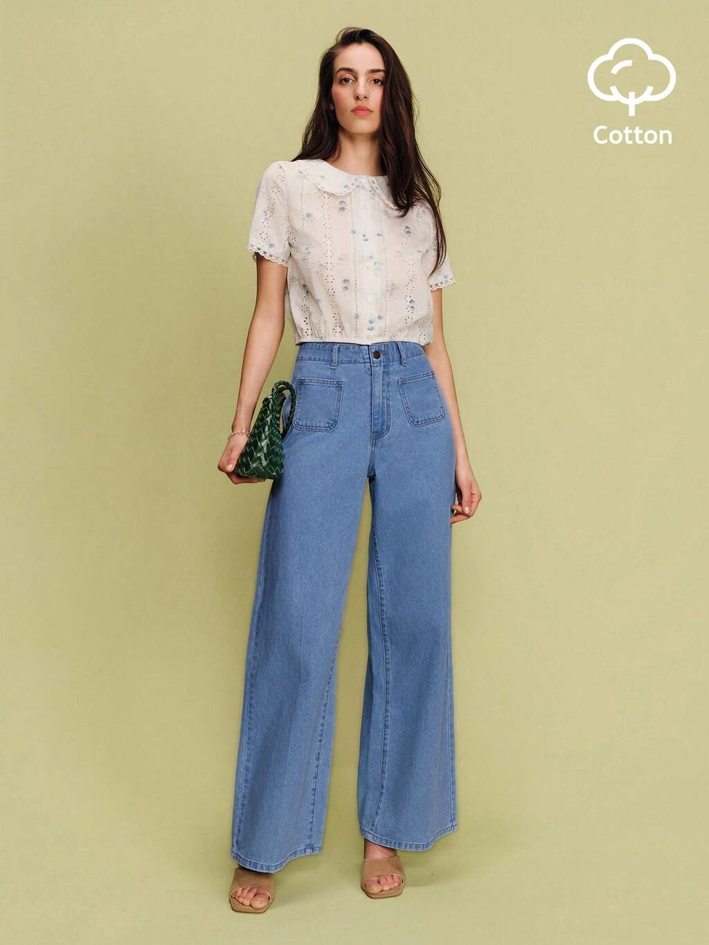 Jeansy z wysokim stanem i szerokimi nogawkami z kwiatowym nadrukiem. Jesienne ubrania dla kobiet. Jesienne stylizacje.